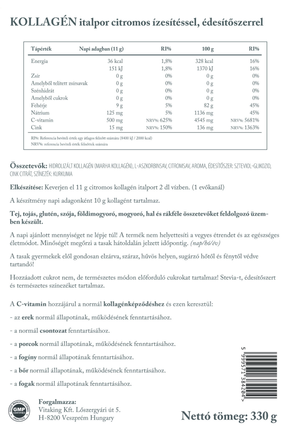 Hidrolizált kollagén (marha kollagén), L-aszkorbinsav, citromsav, aroma, édesítőszer: szteviol-glikozid, cink-citrát, színezék: kurkuma.